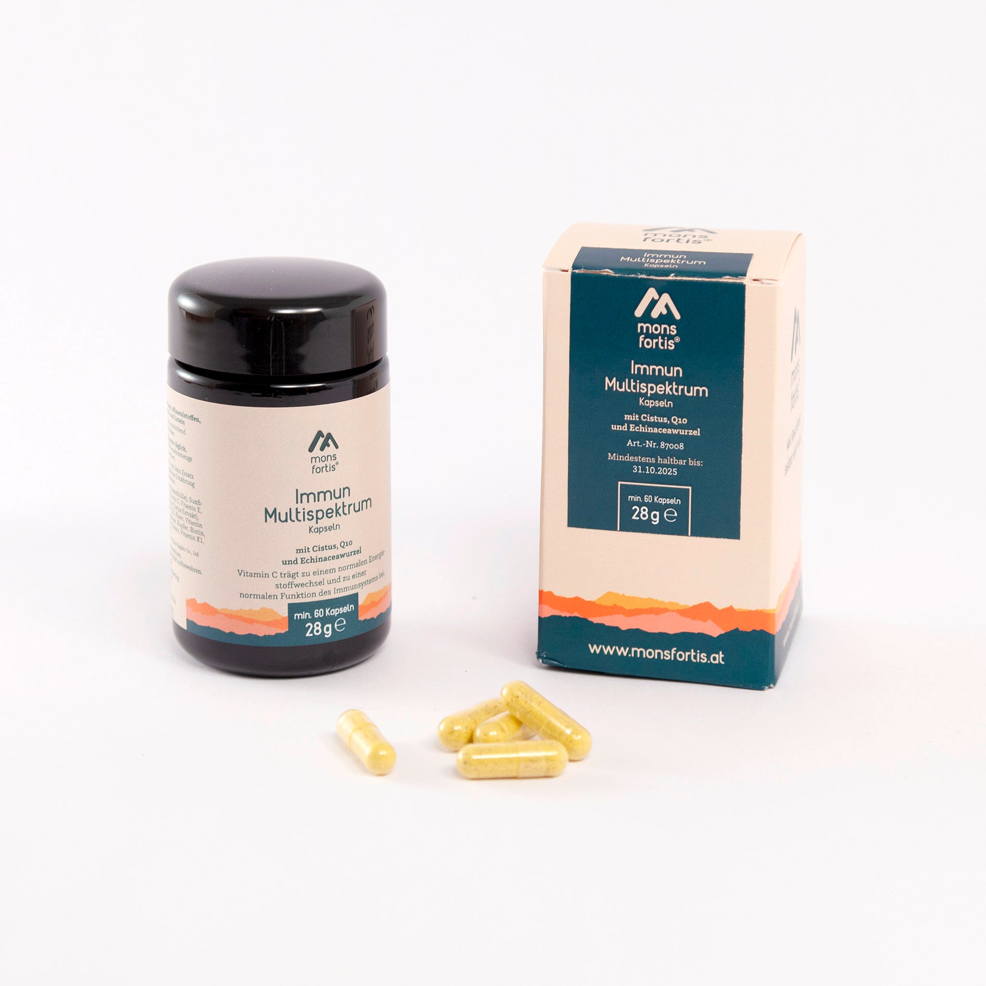 Die Immun Multispektrum Kapseln bieten eine breite Kombination aus essenziellen Vitaminen, Mineralstoffen und hochwertigen Pflanzenextrakten wie Echinacea und Cistus. Sie unterstützen das Immunsystem und sind ideal für die tägliche Grundversorgung. Die Rezeptur ist vegan und frei von Hauptallergenen.